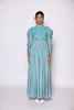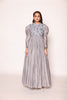 Featuring a beautiful floor length dress with gathers, leg o mutton sleeves and mandrain collar having geometrically embellished bodice using monocromatic holographic sequin, beads & pipes.