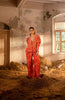 a stylish blazer set with a tomato red floral print and mutton sleeves, made from high-quality fabrics. The jacket is intricately embroidered and comes with matching printed pants.