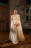 off white anarkali dress with monochrome thread work and hand embroidery. It features a high neck and a scalloped border on the dress and matching dupatta.