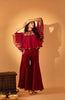 A maroon jumpsuit made of georgette with hand-detailed pockets, paired with a hand-embroidered cape finished with a bor