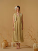 Featuring A Noodle Strap, Calf Length Flared Dress Having A Sequins Line And Gathered Details On The Hemline Paired With Ruched Open Jacket Having Floral Embroidery Placement Embroidery