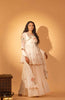 A white skirt set with beautiful thread work highlights and an embroidered peplum finish, paired with a hand-embroidered scallop dupatta.