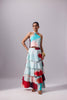 A bold play of rhythm and fluidity, the Abhisha Set in Lagoon is your statement-making answer to modern festive wear. Featuring a dupatta halter top with a spiral metal accent and a tiered maxi skirt, this set is designed to flow, twirl, and celebrate with you. The abstract painterly print in pastel aqua, crimson, and soft blush tones brings a breezy energy to the silhouette. The top ties around the neck and trails down the back with drama, while the elasticated back and flowy layered skirt offer all-day comfort. Perfect for mehendis, destination carnivals, or vacation evenings, this set turns heads while letting you move with ease.