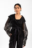 A top featuring a striking shawl collar, voluminous balloon sleeves, and elongated cuffs. Crafted from luxurious silk organza, it is secured at the waist with a belt. A matching inner slip is included.