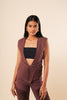 - A brown vest made in Organic cotton canvas. Symmetrical hand stitched pleats on the overlaping flaps hugging at the waist.