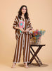 An anti-fit top in brown and white broad stripes and a fan print detailed with shirt collar and cuffs. It comes with a matching print straight pant.