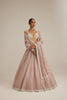 Ash Pink linear embroidered Organza Lehenga paired with a heavily embroidered v neck blouse and Dupatta.