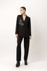 Discover timeless charm in our exquisite black blazer and Trouser Set. Crafted with meticulous attention to detail, it features a tailored fit, notched lapel, and double-button closure. Two front pockets provide practicality without compromising the sleek design. The standout feature is the intricate silver embellishment, adding a touch of opulence. Lined with premium taffeta, it promises both comfort and timeless charm.