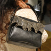 Stella Sling bag (black): Leather Duffel sling bag with handcrafted leather ruffels with one main zip and an embellished leather handle. The inside is lined with premium quality french seude fabric. Accompanied with a silver metal chain strap.