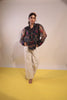 Custom print organza button-down shirt, puffed sleeve with buttoned cuffs, carved hemline, & 3D flower detailing.