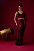 Elegant deep burgundy tissue saree with a soft, flowing texture, accentuated with delicate dangler crystals on the pallu. Paired with a black velvet sleeveless blouse, intricately hand-sequined for a luxurious, glamorous finish.