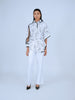 Made from 100% cotton fabric this assymetrical top has draped sleeves and circular cut sleeves with contrast piping. Model height is 5.10" Model wear size M garment length is 25"