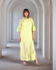 the subtle elegance with this refreshing creamy avocado green straight-cut ensemble, designed for timeless sophistication. Delicate appliqué and intricate thread embroidery form graceful leafy patterns along the lower panel. The ruffled neckline and sleeves add a contemporary flair, perfectly balancing tradition with modern charm. .