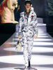 Merging sartorial elegance with avant-garde opulence, the tiger becomes a living toile in this monochrome suit with hand-sketched strokes. Striped cuffs and a sculpted leather bag sharpen the look, capturing The Wild Monarch’s blend of craft, quiet strength, and untamed elegance.
