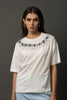 Silken Jersey Shirt, in a pristine white, featuring an intricate array of mixed-size stones and beads for a refined embellishment.