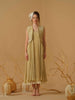 Featuring A Noodle Strap, Calf Length Flared Dress Having A Sequins Line And Gathered Details On The Hemline Paired With Ruched Open Jacket Having Floral Embroidery Placement Embroidery