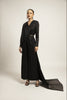 Featuring Black draped jumpsuit in pure satin crepe with the heavy embellishments of Ajrakh stripwork on trail detailed with the Silver Rhinestone beadwork paired up with the fully handcrafted cutdana embellished waistband