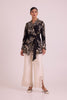 A study in contrast and control. The Farah set pairs a black embroidered wrap blazer, traced with gold and ivory florals, against wide ivory pants edged in delicate cutwork. Effortless yet exacting, it’s for the woman who walks softly but leaves an impression that lingers.