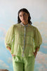The Fern Embroidered Shirt, crafted in chanderi, features beaded embroidery on its bodice, creating a checkered pattern. Its printed collar complements the pattern, while the gathered sleeves in organza feature delicate floral embroidered motifs, adding a whimsical touch. The back is adorned with a floral print.