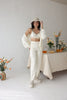 The Flicker set comprises an off-white oversized shirt adorned with beautiful hand-embroidered buttons in the front. Underneath is a solid off-white rayon moss bralet boasting multicolor braided detailing, adjustable straps, and delicate embroidery along the waistline for added elegance. Paired with off-white cargo straight pants featuring two side pockets. • Shirt front Length – 28 inches