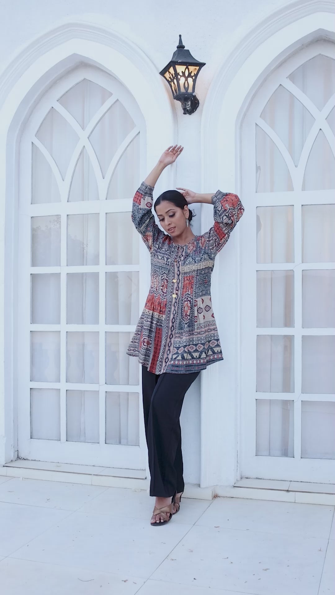 Printed tunic ,has a tie up collar, 3/4th sleeves, Curved hem