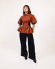 A timeless silhouette, this top with contrast side panel is designed to be fitted through the waist and flare toward the hem. Complimented with pleated puff sleeves and soft pleats through the hem, finished off with front conceal zip closure. Model wear size S model height is 5'8 garment length is 27"