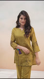 Kaftanize presents a Mustard green tunic adorned with embroidered thread work, paired with Pants in muslin fabric. The ensemble features 3/4th relaxed sleeves, solid color, and is crafted from woven fabric, offering a comfortable and relaxed.