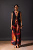 Bold yet rooted, the Kayana Set in Inferno is a striking co-ord crafted from 100% linen. The sleeveless, deep V-neck jacket features contrast panels of Inferno hues against solid black, creating a sculptural silhouette that celebrates both tradition and modernity. Paired with wide-leg trousers in a fiery blend of red, ochre, and deep black, the set embodies fluidity and freedom of movement. The look is effortless yet commanding, perfect for festive evenings, cultural gatherings, or simply making a statement in everyday wear. Style it with earthy jewelry and neutral heels for a minimal look, or lean into its drama with layered accessories for a bolder mood.