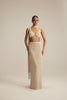 Light beige Pencil Skirt paired with a heavily embroidered v neck blouse and Satin Stole With Cascading Pearl tassels.