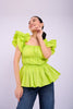 Turn heads with the bold and playful Malla Top in Lime. This vibrant piece is all about volume and texture, featuring dramatic ruffled sleeves, a flattering square neckline, and a fully ruched bodice that hugs in all the right places. The peplum hem adds a flirty finish, making it a standout choice for sunny days, brunch dates, or a fun night out. Light, airy, and full of personality, this top is your new summer essential.