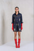 Indulge in the timeless romance of English gardens with our captivating black button-down shirt dress. Metal stud highlights in the front add a rebellious edge, while golden metal buttons gleam with sophistication. Cinched at the waist with a belt boasting metal eyelet accents, this dress exudes a glamorous allure that effortlessly merges the ethereal beauty of roses with urban chic.