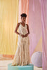 Offwhite hand dyed short anarkali top with glass beads and rain-drop hand embroidered body and georgette ruffled flare. Paired with offwhite hand dyed georgette ruffled palazzo pants.