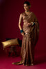 Crafted in a rich mocha shade, this soft and flowy tissue saree features a lustrous finish with delicate jhallar lace along the border. Paired with a matching blouse in the same fabric, designed with a translucent back and sheer sleeves highlighted with gota borders, this saree is perfect for festive and wedding occasions.