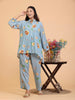 A mushroom print grey top with mandarin collar detailed with an inverted pleat and placket in front and gathered shirt yoke in both front and back. It comes with a matching print straight pant.