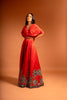 Feature scarlet red drape gown in gajji silk with patch work n cutdana detailing on the flare of the gown with zardosi work belt
