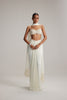 Off White Satin draped skirt set paired with a heavily mirror and pearl embroidered blouse and a satin stole.