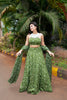 This is the perfect bridesmaid lehenga for the wedding ceremony! The set includes a voluminous cancan lehenga skirt, a blouse, and an Organza dupatta. The blouse has been hand-embroidered with pearls, mirrors and glass beads. The lehenga is made in a floral olive green print on Organza Satin. And it comes with an Organza Dupatta in the same print with sequin scallops on all sides.