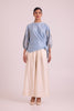 A breath of fresh mountain air — the Ooty set pairs a powder-blue tie-up top with softly embroidered sleeves and ivory wide-leg pants that move like mist. Effortlessly graceful and quietly confident, it’s the kind of ensemble that feels at home from brunch to gallery strolls.