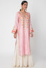 This long tunic is embellished with gota work all around the neck and buttis at its length. The bell sleeves blocked with multiple colors adds to the beauty.