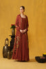 Featuring a square neck full length flared dress with an attached dupatta having a border and applique embroidery highlighted with sequins, beads and pipes at both the ends of the dupatta which is draped over the shoulder