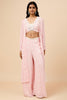 Essay by Sumedha Agrawal features a White and Pink Floral Stripes Cape Set. It comes in a set of a blouse, palazzos, and a cape. The blouse has been hand-pleated and its belt and cape borders have been hand-embroidered with pearls, white glass beads, resham, and mirrors. Made with double georgette and the highest quality of santoon lining you do not have to worry about transparency with this white outfit.