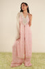 This Kurta Set is made in a unique floral striped print. The Kurta has a heavy neck embroidery that has been finished with fringed lace and the hem is hand embroidered with the same pearls, white glass beads, resham, and mirrors. While the hand embroidery makes the Kurta classic, the center slit makes it more fun. The Kurta is paired with palazzos in the same print and a white organza dupatta with hand-embroidered mirrors and pearls.